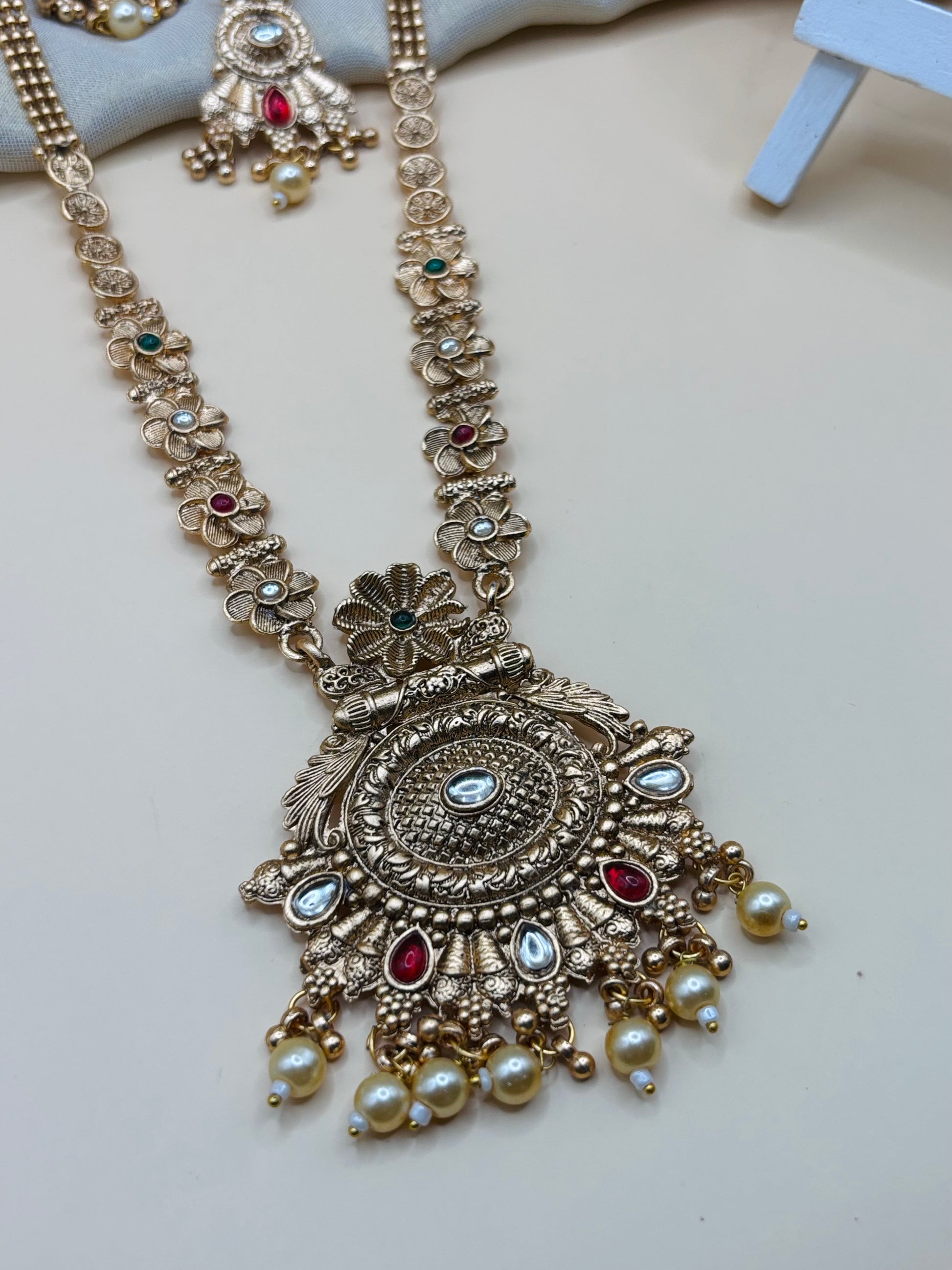 A beautifully detailed antique gold necklace with a circular medallion pendant, highlighted by ruby red, green, and white stones. Pearl drops add a graceful touch, while the matching earrings complete the traditional and festive look.