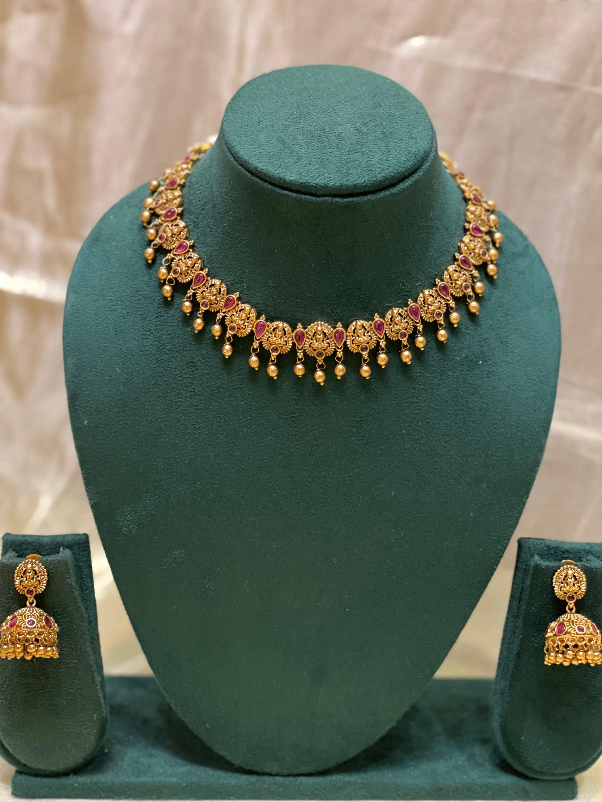 This elegant antique-finish necklace showcases intricate gold-toned detailing with ruby-red teardrop stones and golden bead danglings. The set includes classic jhumka earrings.