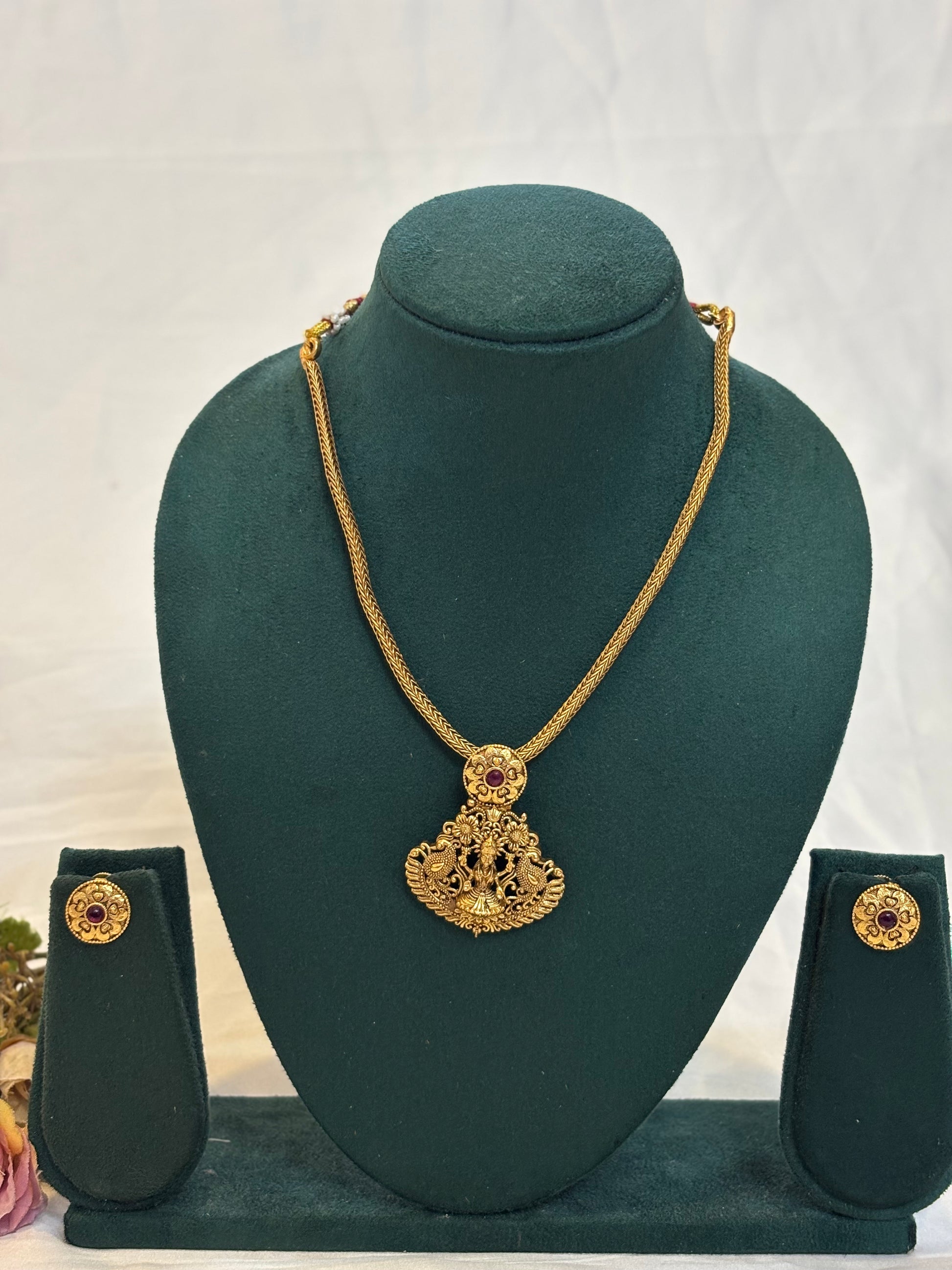 Graceful temple work necklace with a beautifully crafted Lakshmi pendant accented with ruby stones. Comes with matching studs for a complete traditional look.