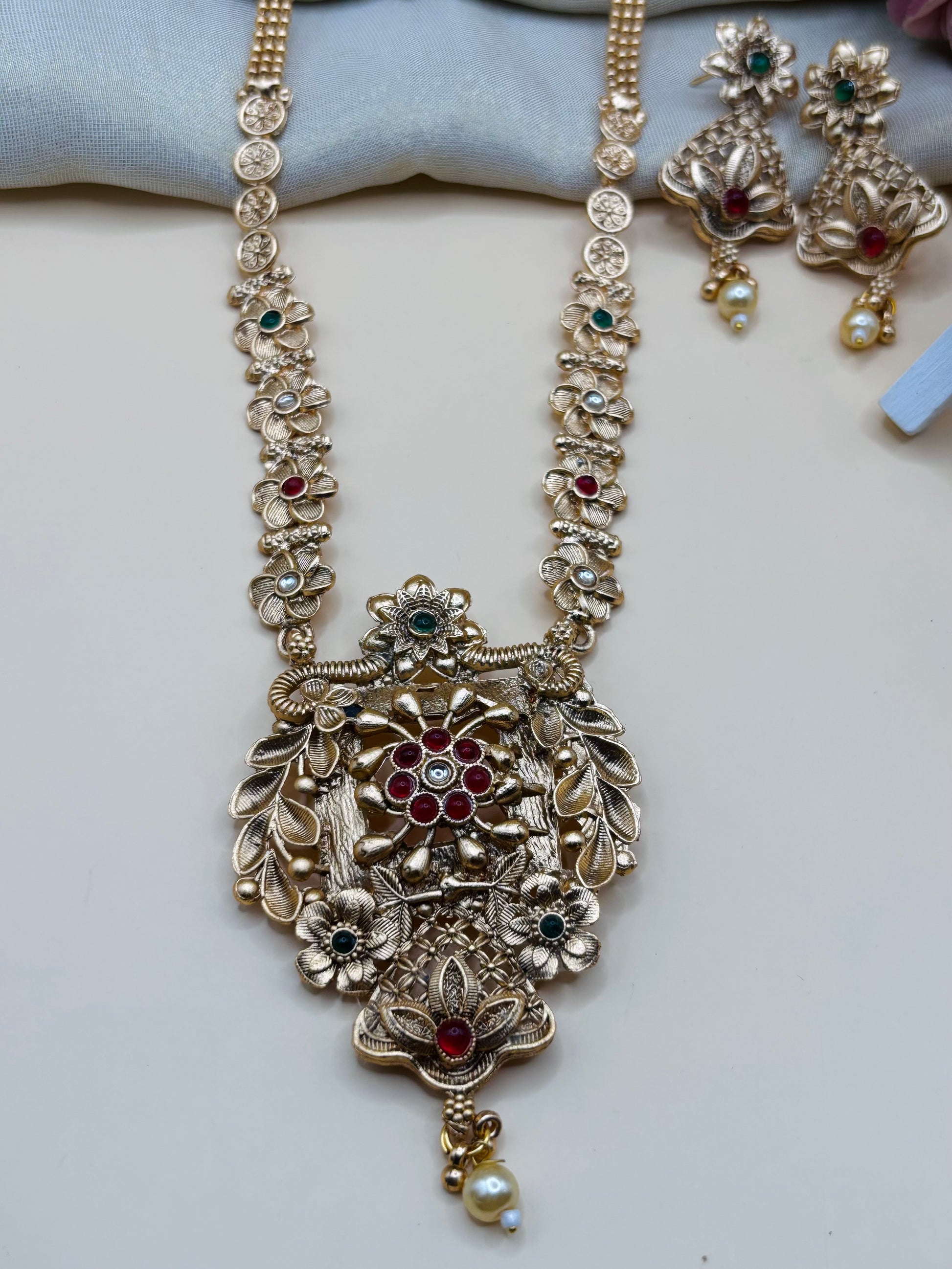 An intricately designed antique gold necklace featuring lotus and floral motifs, highlighted with ruby and emerald stones. The matching earrings with pearl drops complete the look.