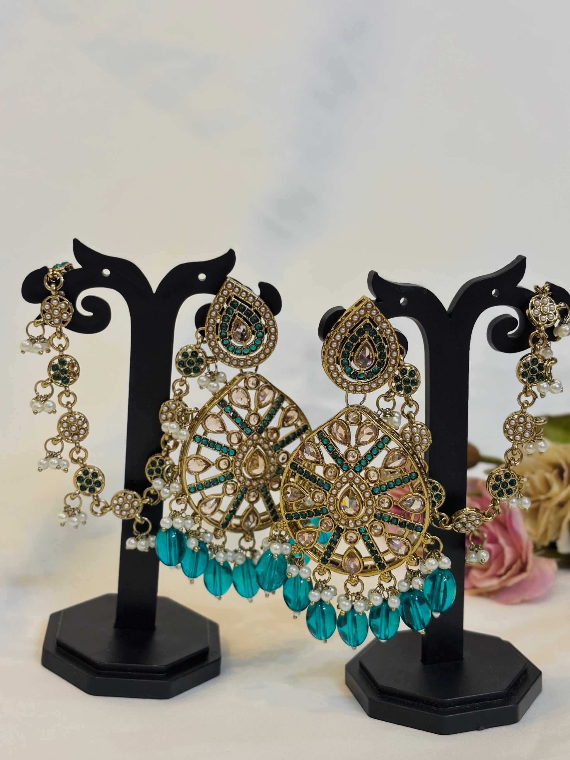 A stunning pair of chandbali earrings designed with intricate kundan work, accented with green enamel detailing and finished with bold emerald-green droplet beads. The circular design, highlighted with pearl hangings.