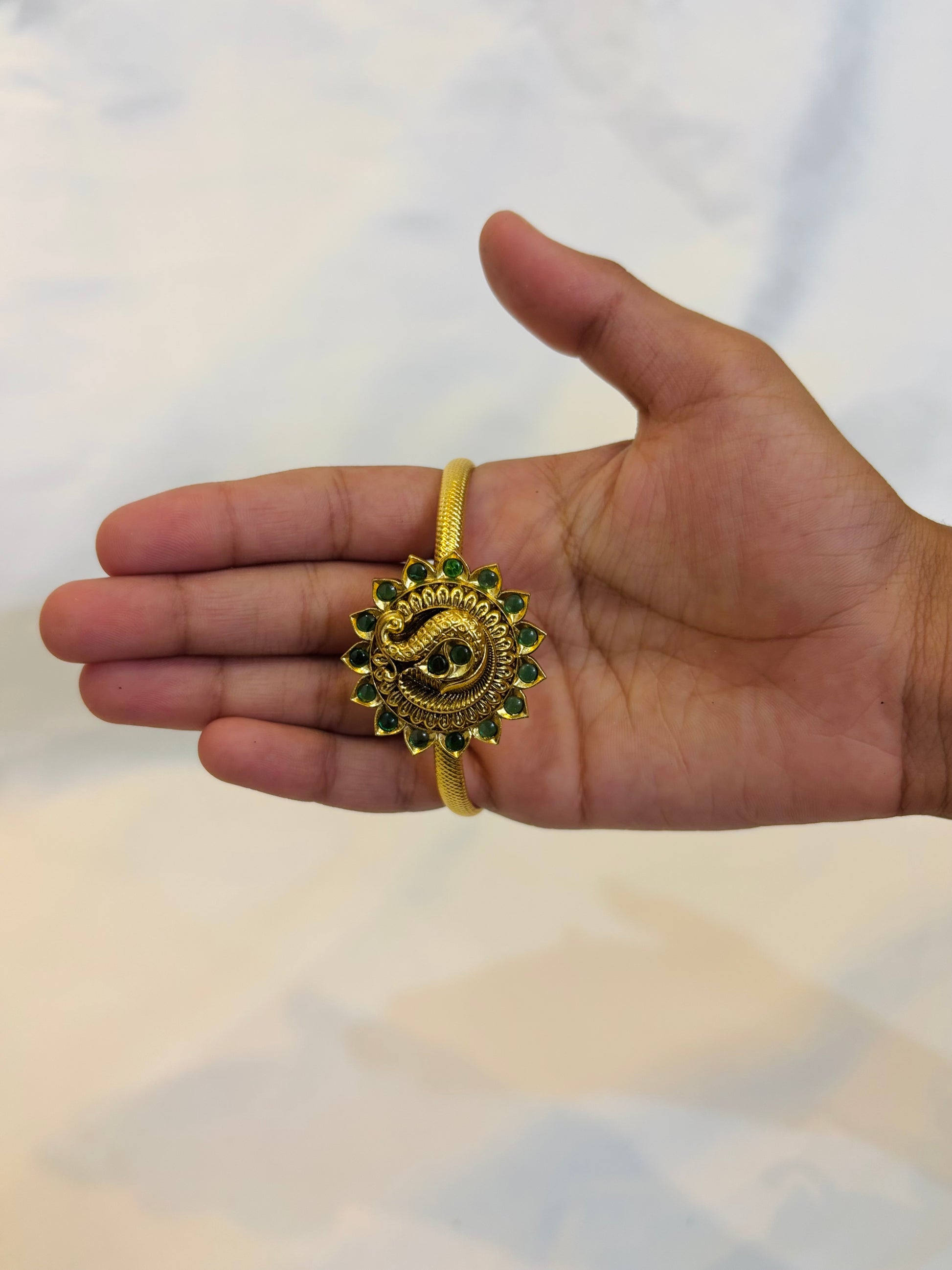 This elegant emerald-studded peacock bangle adds a royal charm to your festive look.