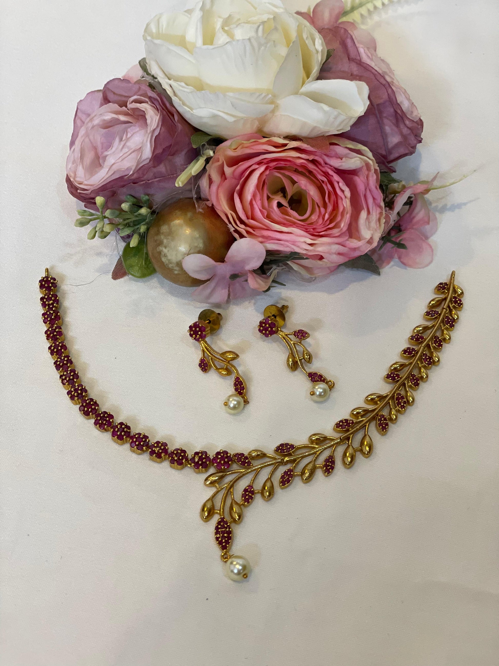 A delicate floral necklace accented with pink stones, gold-toned leaf details, and a pearl drop. Comes with matching earrings for a graceful, elegant look.