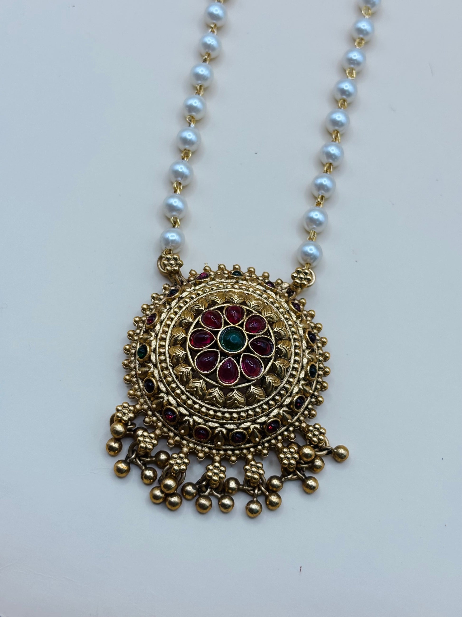 A graceful pearl-beaded haaram adorned with a classic gold-toned Kundan pendant, beautifully embellished with red and green stones. Paired with matching stud earrings.