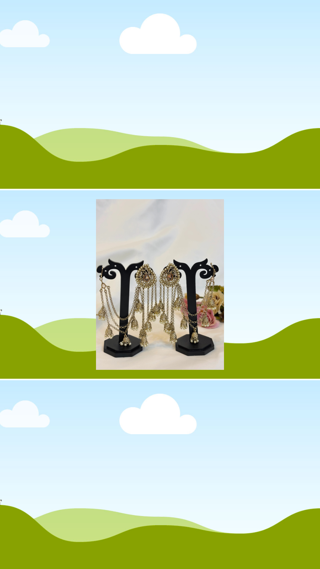 An elegant pair of statement earrings featuring intricate filigree work with a central stone, bordered by delicate pearls. The cascading chains are adorned with multiple jhumkas embellished with tiny pearls, adding grace and movement.