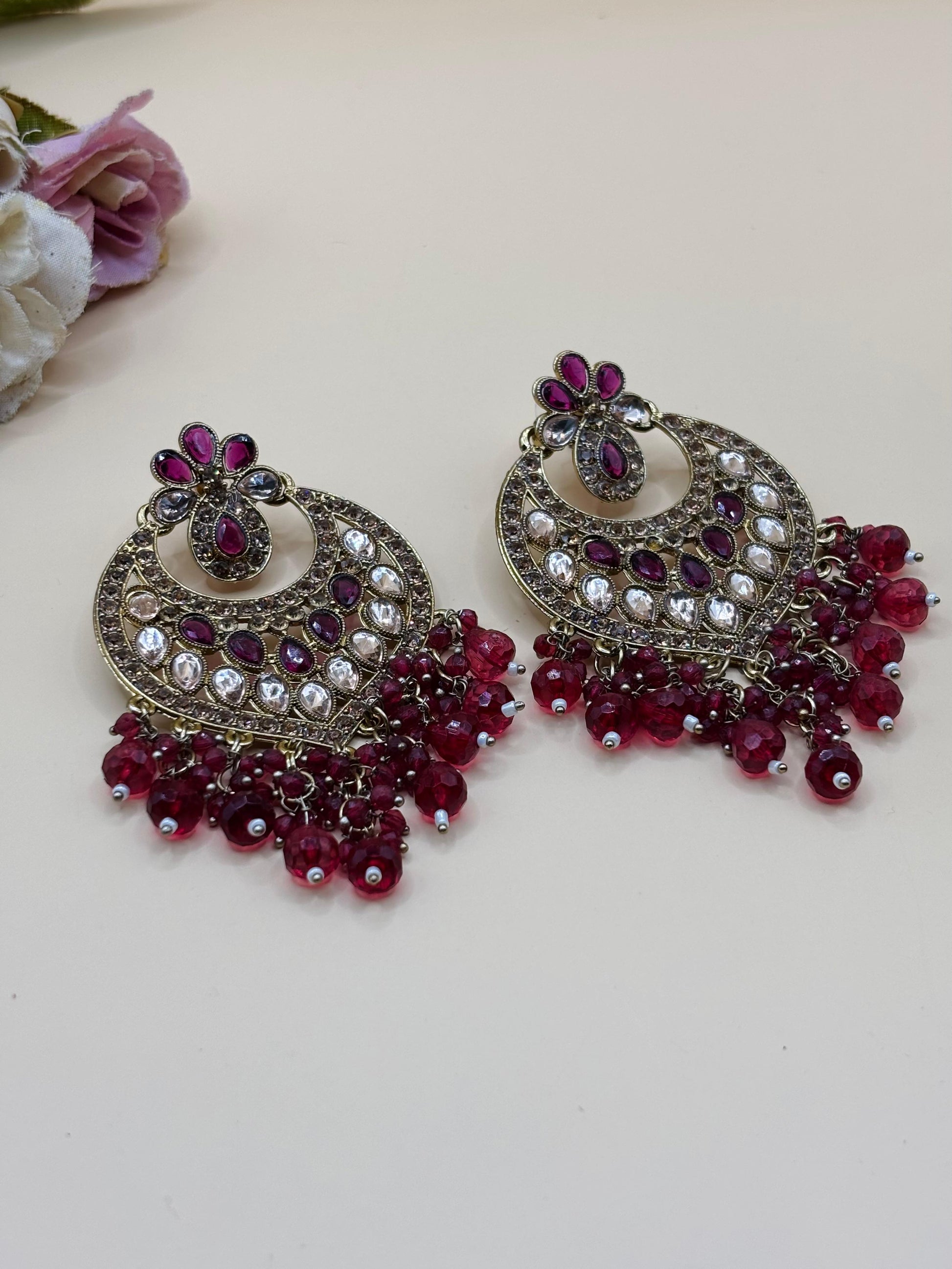 Elegant Kundan earrings adorned with ruby red stones and sparkling white kundan work.Finished with hanging red beads for a bold and festive touch.